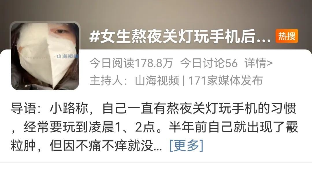 近日微博熱搜#女生熬夜關燈玩手機后眼部囊腫#,一名22歲女生一直有熬夜關燈玩手機的習慣,半年前發現自己長了霰粒腫,但因不痛不癢就沒有干預,繼續熬夜,最終導致霰粒腫變大變紅,通過手術切除。